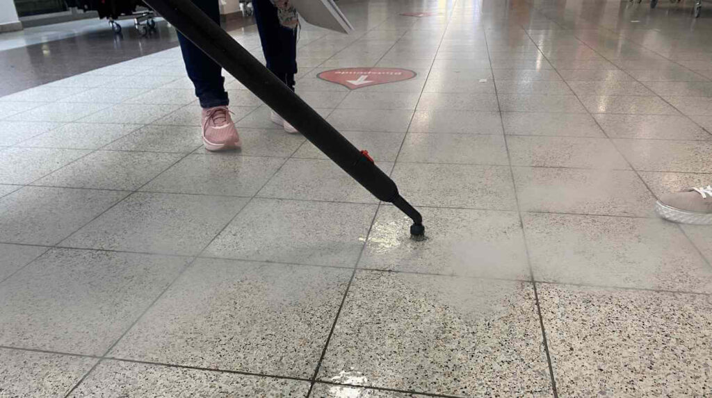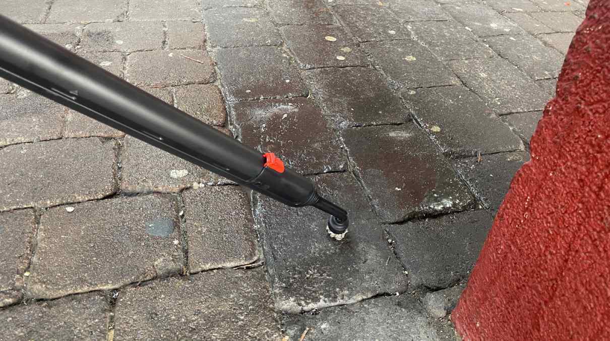 Die Lanze des laufenden GUMCLEAN3000 Dampfreinigungsgerätes mit der geeigneten Bürste (Kunststoff, Messing, Stahl) auf den Kaugummi aufsetzen. Die ideale Betriebstemperatur beträgt 100 bis 125°C bei einem Druck zwischen 2 bis 6 bar.